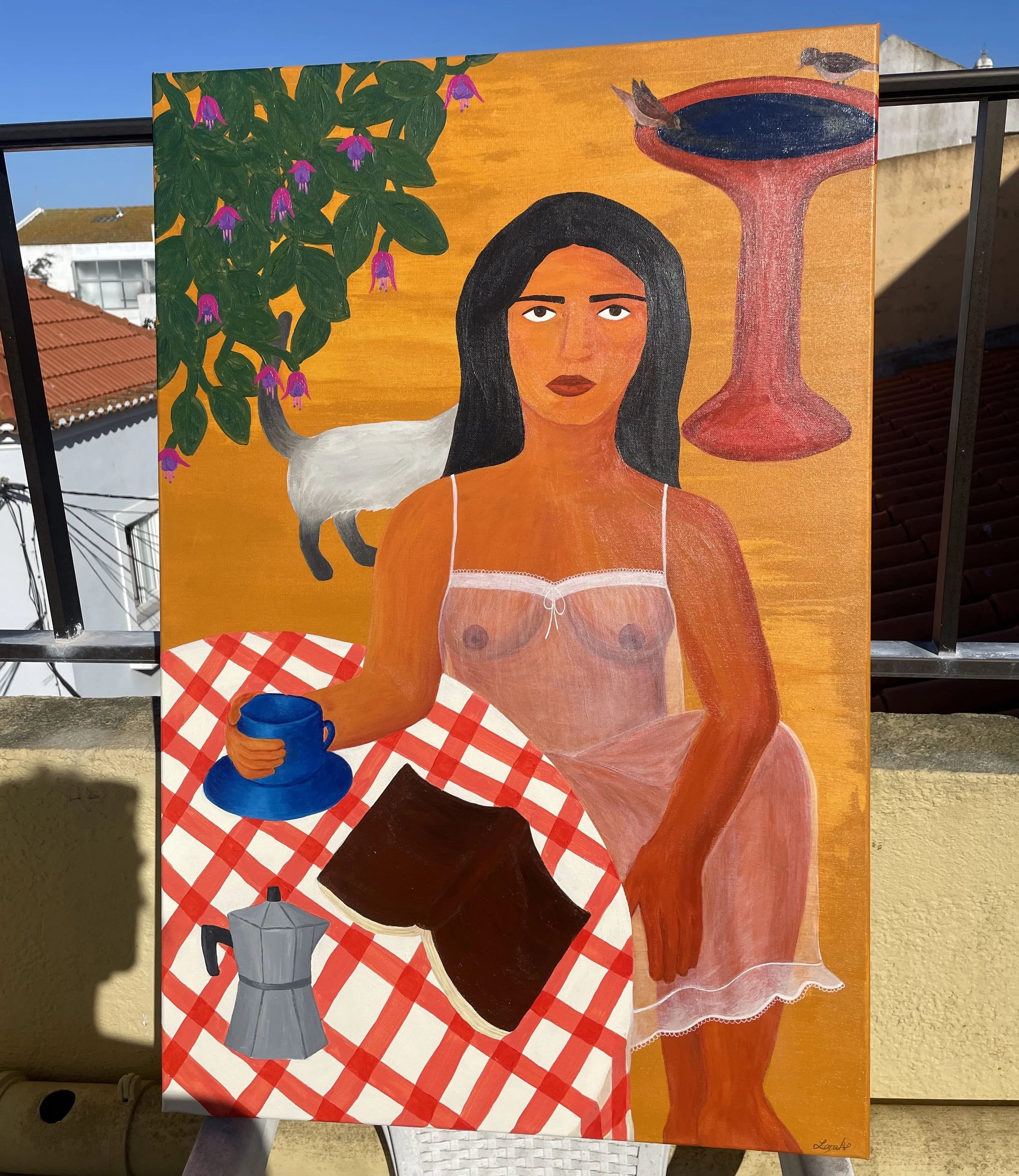 She hears a meow just as her moka pot has finished spluttering, and takes a seat outside next to her fuchsia bush where her adopted cat (adopted from where, we do not know) rolls in the dust underneath it.